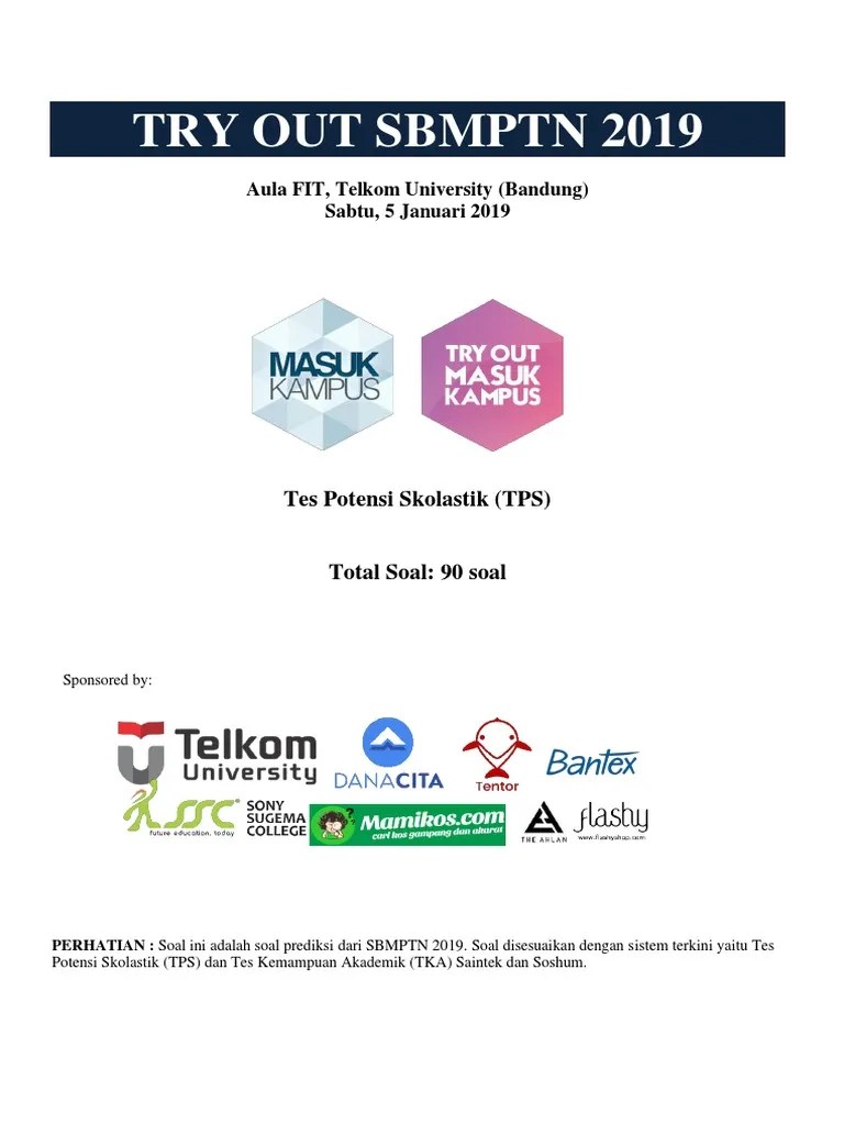 Sedangkan untuk soal tes potensi skolastik (tps) utbk terbagi menjadi soal tps pengetahuan kuantitatif, latihan soal tps penalaran umum, soal latihan tps pengetahuan dan pemahaman umum, dan soal soal tps memahami bacaan dan menulis, dimana dalam soal ini termuat juga soal soal tps bahasa inggris. Kelompok ujian pada utbk sbmptn 2021 dibagi menjadi 3 …